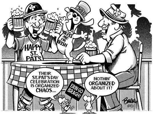 March 7, 2018 Good morning ... Here's the first of two ST. PAT'S DAY cartoons for you — this one featuring the typical St. Pat's celebration as it's enjoyed in most Irish strongholds, such as my nearby big city, Butte MT [aka, "The Richest Hill on Earth"]. BTW: The second toon, following shortly, is alcohol-free. HA! You'll find both of these ST. PAT'S toons & 7 more in my newest Category at: http://www.barryscartoons.com/a_STPATSDAY.html Cheers! :))) barry |