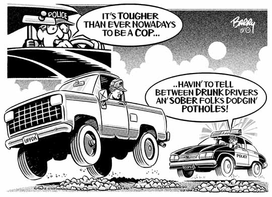 April 20, 2018 Hey there ... Here's the second SPRING cartoon for today. I've chosen to send it because it covers three [3] timely bases in most places: 1) It points out how hard it is to be a COP these days. 2) It points a not-too-subtle finger at DRUNK DRIVING. 3) It points to that perennial Spring evil — POTHOLES! You'll find this toon & 14 other new additions to my online Toon Categories at: http://www.barryscartoons.com/a_SPRING.html Have a swell weekend, folks! :))) barry |