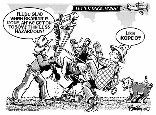 April 24, 2018 Here ya go ... This AG cartoon is serving double duty: It's a timely tie-in with cattle branding, plus it foreshadows the beginning of RODEO season — which just happens to start in May with the Buckin' Horse Sale in Miles City MT, where rodeo producers show up each year to view the new crop of buckers. I've gotta admit there's usually more horsing around going on in the grandstand than in the arena — which probably is no surprise to you, eh? HA! You'll find this toon in my AGRICULTURE Category at: http://www.barryscartoons.com/a_AGRICULTURE.html I'll be creating a separate RODEO Category soon. Have a swell week! :))) barry |