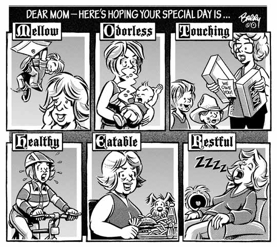 May 3, 2018 Good morning ... Here's the first of two MOTHER'S DAY cartoons for you. I've gone with this one because it offers so many different views of Mothers in action. Once you have a good look at the toon, you're likely to agree that most Moms out there will easily identify with ALL of these views. HA! I've uploaded this toon & 9 others into my new MOTHER'S DAY Category at: http://www.barryscartoons.com/a_MOTHERSDAY.html In this Category, you'll find cartoons that span virtually the full gamut of MOTHER'S DAY experiences: From Mom & the kids blissfully joyriding on the family 4-wheeler, to a couple of toons featuring highly unusual gifts for Mom — one thanx to genetic engineering & the other due to the thoughtfulness of a very practical hubby. I'll have today's second cartoon to you shortly ... :))) barry |