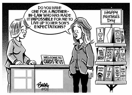 May 3, 2018 Here ya go ... A cartoon that salutes certain MOTHER-in-LAWS out there — and yet, is also likely to evoke an "ain't that true?" response from certain younger Moms who can easily put themselves into the mindset of the poor gal who's featured in the toon. I've added this toon to the 9 others in my new MOTHER'S DAY Category at: http://www.barryscartoons.com/a_MOTHERSDAY.html NEXT: Not knowing when GRADUATION will occur in your neck o' th' woods [or prairie], I'll getting started right away on something for the graduating seniors out there — & their parents & their school faculties. Yep, just one more day till TGIF — as if there really is such a thing in the news biz, eh? HA! :))) barry |