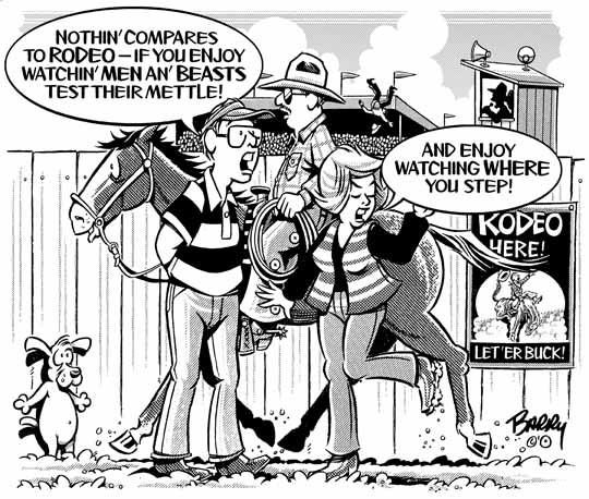 May 11, 2018 Good morning ... Figured I'd better get something on RODEO to you about now, since the #1 cowboy sport opens its season next week in Miles City MT — hence, this first of two RODEO cartoons. It's one that salutes non-cowboy attendees who are inclined, naturally, toward buckin' horses & their daring riders — &, simultaneously, pokes fun at others in attendance who'd rather that the more "natural" aspects of RODEO didn't get too close. I'll be posting my RODEO Category a little later today & will send you a heads-up when it happens. Today's second RODEO toon will follow shortly. :))) barry |