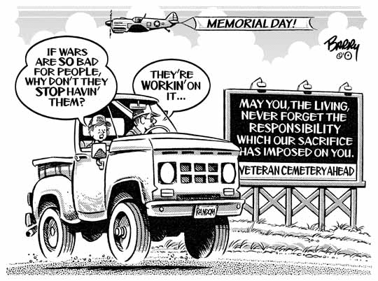 May 17, 2018 Good morning ... Yep, it's the first of two MEMORIAL DAY cartoons for today — this being the only time of the year when your 'toonist gets totally serious [yep, it's possible!]. That said, I really like the fact that the kid in the toon has such a simple, albeit profound, question for his Dad. There's an innocence involved that transcends the horrific nature of war. I'll bet the combat vets thereabouts will recognize it. You'll find this cartoon & 13 other Memorial Day toons in my MEMORIAL DAY Category at: http://www.barryscartoons.com/a_MEMORIALDAY.html Plus, there's a generic holiday cartoon ["5-DAY WEEKEND"] that I'm adding to each of the fair-weather Holiday Categories [MEMORIAL DAY, 4th of JULY & LABOR DAY]. Actually, this toon should run well anytime from now to Fall. The second MEMORIAL DAY cartoon will follow shortly ... :))) barry |