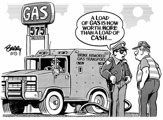 June 9, 2018 Good afternoon ... Here's the first of two cartoons today on escalating GAS PRICES — both toons likely being a bit ahead of the curve for your area, if prices there haven't jumped as high as they have here. Would you believe? — as per the last time I filled up, I was paying 30¢ per gallon more in a single week! In both toons, I have fun with worse case scenarios — in the one attached here, by exaggerating what gas transport may become if prices stay to their current, rapidly rising course. You'll find this toon & 11 variations on the theme in my new GAS PRICES Category at: http://www.barryscartoons.com/a_GASPRICES.html I'll be back soon with today's second offering ... :))) barry |