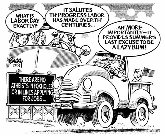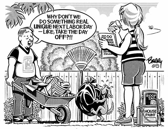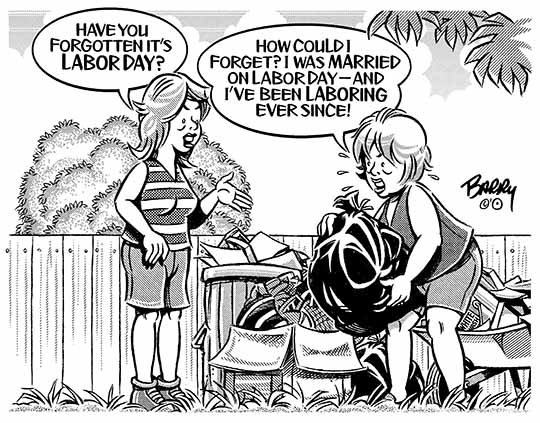 August 24, 2018 Good morning … Today’s attached LABOR DAY cartoons illustrate three diametrically opposed takes [so they seem?] for this last holiday of summer. The first toon ["DAY OFF"] features what you’d typically expect from a man who wonders if he’ll ever know a reprieve from his wife’s "TO DO” lists — & he LABORS on. The second ["EVER SINCE"] presents a scenario more than few wives out there may recognize — it’s one female's perspective on LABOR DAY realities. The third ["LAZY LABOR DAY"] is a simple attempt, gender-free, to define the meaning of LABOR DAY — resulting in what I consider a most appropriate approach to the holiday. To whit: Laziness uber alles!!! You’ll find all three of the attached toons, plus 11 [ELEVEN?!!] more online in my LABOR DAY Category at: http://www.barryscartoons.com/a_LABORDAY.html PLEEEEZ NOTE: In the future, if you feel you’re missing a cartoon I promised, it might just be that once again I’m experiencing email difficulties. In which case, I recommend you czech out my NEW Site at: http://www.barryscartoons.com What you’re missing is very likely up there! That said, being the unrepentant positive thinker I am, I’m gonna assume my recent spate of electronic cataclysms has finally come to an end. But then, you know what they say about “assume," eh? — how it can make an "ass" out of “U" & “me.” HA! NEXT: Local FOOTBALL … :))) barry |