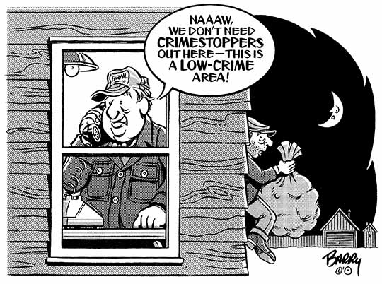 September 21, 2018 Here ya go, guys … This CRIMESTOPPERS cartoon is my 3rd & FINAL offering of Friday's promised cartoons. I had intended to hold off on sending it till I got around to creating a CRIME Toon Category — but, it does fit in rather nicely with my earlier sends on the TEST DRIVE I’ve taken this week. Ya know, for variety’s sake! Yep, it’s definitely rural — as opposed to in-town GOVT. & POLITICS. Plus, from reading through the comp subs you send me, it's very evident that CRIME is no longer mostly the domain of urban/suburban centers. Nope, rural areas across the country are being targeted for break-ins [among other crimes] more & more frequently. So, sad to say, your readers are likely to find this toon pretty relevant now. Until I get my CRIME Category built, I’m uploading this cartoon to OUTA TOWN at: http://www.barryscartoons.com/a_OUTATOWN.html I’ve placed the toon on the TOP row/LEFT side. Now — to post that IN SHOCK toon on my site ... :))) barry |