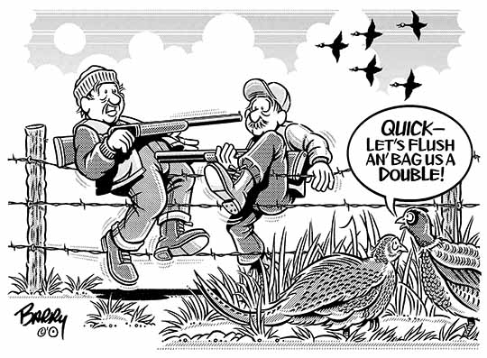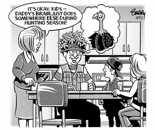 September 28, 2018 Good morning … I’m sending you a big bunch of HUNTING cartoons today, since I’ve just posted 30 [THIRTY!!!] toons of their breed to my new online HUNTING Category. It’s my largest upload ever! — so far. Of my many favorite subjects to cartoon, HUNTING SEASON has always been [far & away] my MOST favorite of all. Which, I admit, does seem a bit weird to me considering I haven’t hunted for more than 5 decades! But, I totally love the graphic paraphernalia that HUNTING makes available to this cartoonist — such as the critters, the weapons, the vehicles, the outdoor settings, etc, etc. I’ve split today’s HUNTING toons between two emails. This first one deals with BIRD & WATERFOWL hunting, while the second focuses on BIG GAME hunting. BTW: I’m attaching 3 versions of the "BRAIN GOES" cartoon here. Pick your feathered poison. HA! You’ll find a total of 12 BIRD HUNTING toons to choose from in my new HUNTING Category at: http://www.barryscartoons.com/a_HUNTING.html Now, onto my BIG GAME HUNTING email! :))) barry |