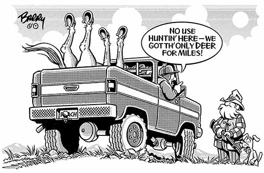 September 28, 2018 Here you go, guys … As promised, I’m attaching the BIG GAME versions of today’s HUNTING cartoons — 5 of them in all. Then again, the first toon hosts a few options. Yep, once more I’ve totally enjoyed poking fun at our hunters & their passions for "The Hunt”. Clearly, mankind has not lost any of its verve for tracking, targeting & killing wild critters for the sake of another year’s protein. And who can blame them, eh? — given the exorbitant prices at our meat counters these days! You’ll find a total of 18 BIG GAME HUNTING toons to choose from in my new HUNTING Category at: http://www.barryscartoons.com/a_HUNTING.html. Once you're there, click on "BIG GAME". Okay. Between today’s two emails, you now have a wide array of HUNTING toons to choose from — plus all those in their respective online Categories. Here’s hoping you pick thru them wisely — meaning, I wouldn’t want my HUNTING silliness to offend anyone, would I? Then again, is that really possible??? HA! :))) barry |