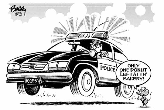 October 25, 2018 Good morning … Today I attaching 3 cartoons on LAW & ORDER, as seen from very different angles. For sure, it’s a serious topic — but, hopefully, your 'toonist has managed to find some chuckles in it. 1) 35 MPH ~ This toon takes a poke at BIG CITY crime — which, I’m thinking, reflects how many small town folks view their own excursions to the urban wonderlands. Though, really, the only wonder in them is that some locals persist in returning to the scene of so much criminal activity! BTW: This cartoon can also be seen as what once was called a "Shop At Home" toon. 2) JAIL BUDGET ~ In spite of the title, & the artwork that plays off it, this toon actually relates to broad span of local law enforcement issues, not just jail inadequacies. Same for the budget cuts that often handcuff effective police procedures. 3) ONE DONUT ~ There is nothing socially redeemable in this cartoon — except, maybe, it might help to humanize law enforcement a bit. Other than this possibility, it’s just pure fun. You’ll find all 3 of these toons, plus 13 others on the subject, in my new LAW & ORDER Toon Category at: http://www.barryscartoons.com/a_LAW&ORDER.html Have a swell weekend, guys … :))) barry |